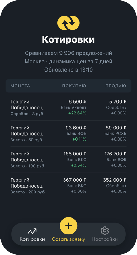 - 📈 Сравнивайте цены на монеты у официальных дистрибьюторов Банка России